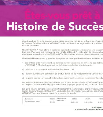 le plan de rémunération d’ORGANO™. La réussite d’un Distributeur dépendra de ses efforts personnels, inclus mais non limités aux compétences et au temps investi à développer l’affaire.