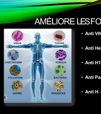 AMÉLIORE LES FONCTIONS IMMUNITAIRES • Anti VIH: PMID 22361494 • Anti Herpès : PMID18047445 • Anti H1N1: PMC 3096471 • Anti Papillome humain: IntJMed Mushr.v12.i3.70 • Anti H. Pylori et Staphylocoque : PMID23557368